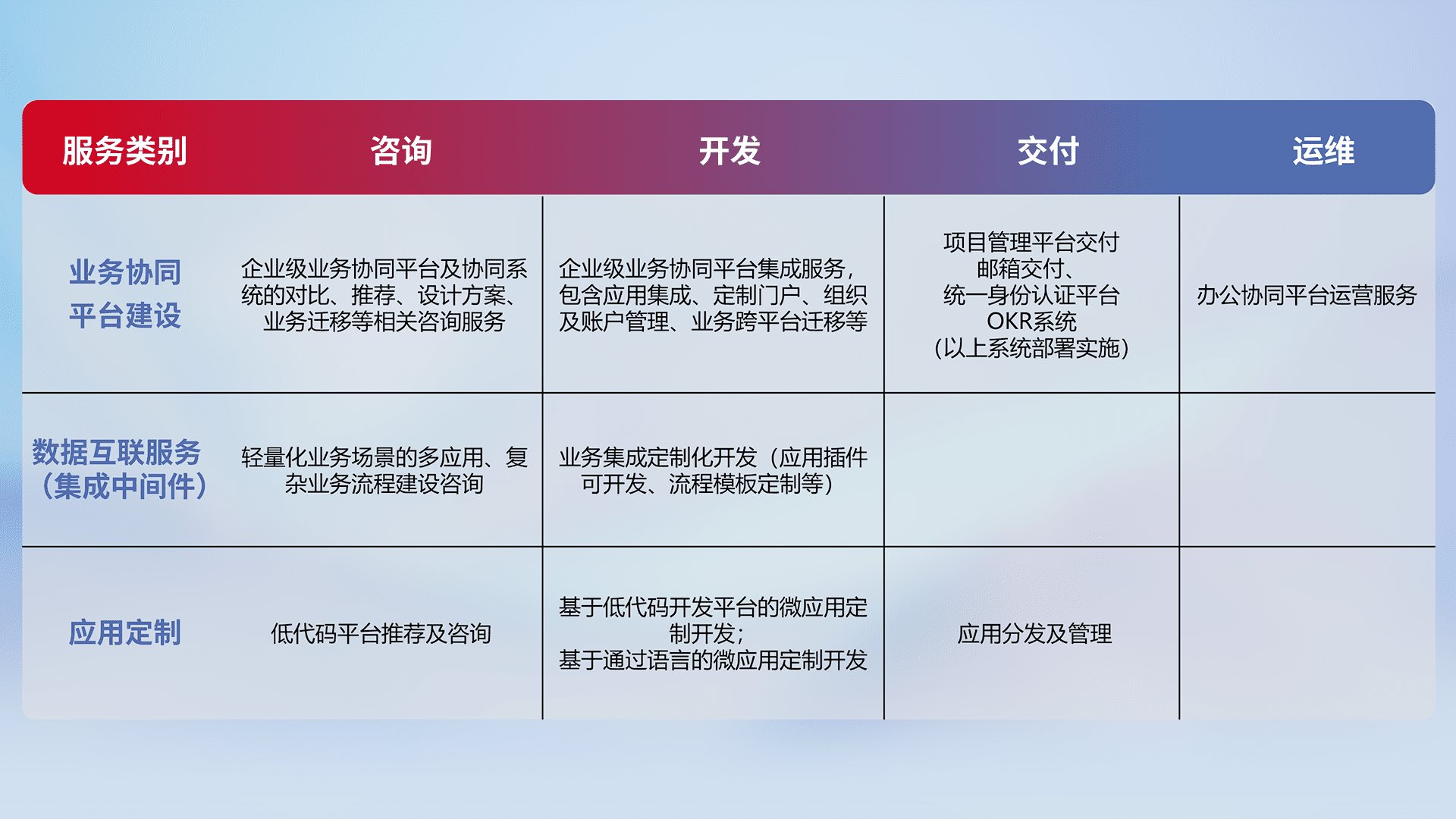 针对钉钉、、企微、、、IDaas等平台级产品提供产品的规划、、方案、、、、交付、、定制化开发等服务,,实现如统一协同办公、、智能客户服务、、、混合会议管理、、、智能数据查询、、、等业务场景,,,实现数字化转型。。